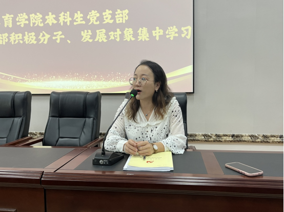 太阳成集团tyc33455本科生党支部组织委员张静,围绕党员发展工作流程及相关材料撰写的注意事项进行了讲解。帮助入党积极分子和发展对象熟悉党员发展流程和要求。高标准、高质量,抓实、抓细、抓好党员发展工作。