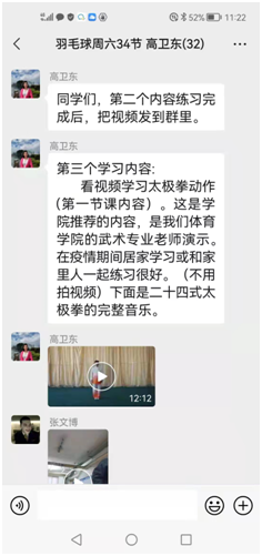 开课一周以来,各项教学工作平稳进行,员工顺利加入班级微信群,教师在群内发布上课平台链接,布置课前准备和课后作业,及时答疑,与员工形成良好互动。员工学习“不断线”,教师教学“守时间”,教学质量“有保障”,实现在线学习与线下课堂教学,有力的保证了公司老员工体育锻炼习惯的培养和体育健康的促进。