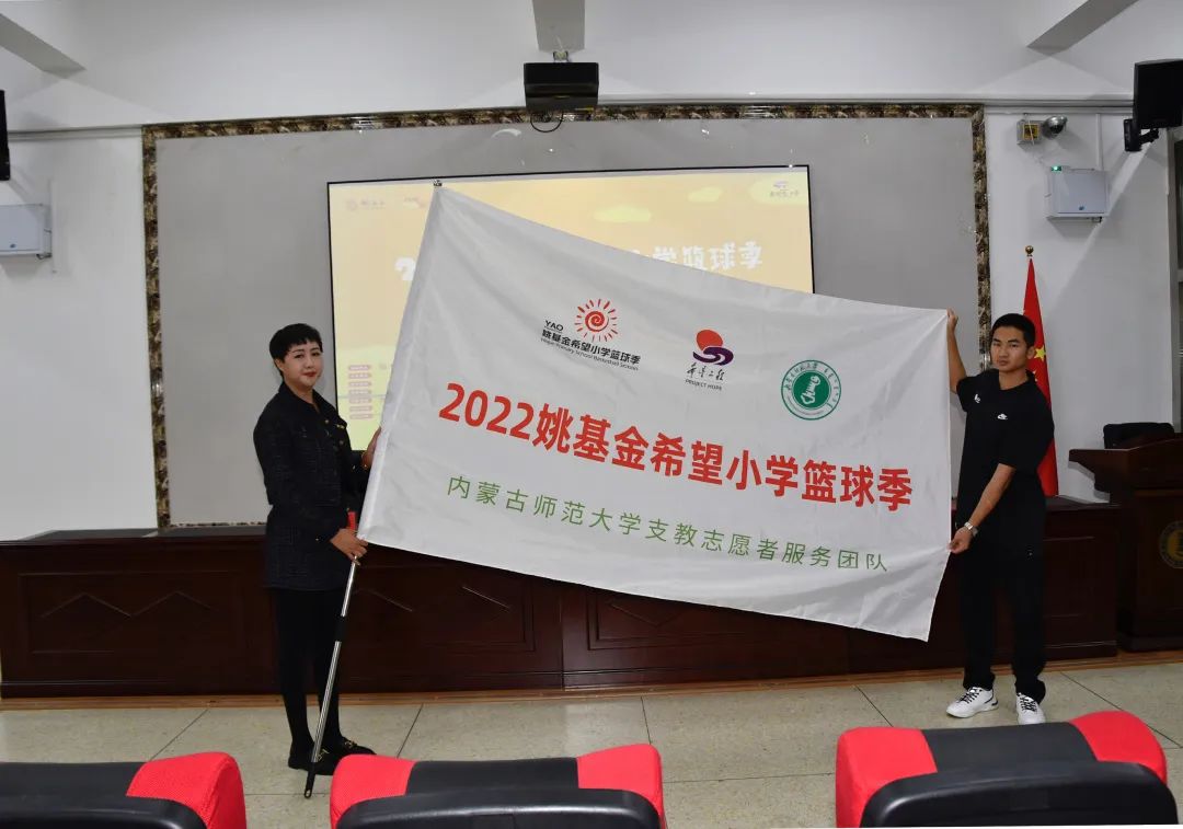 内蒙古青基会项目管理部副部长白玉瑾向支教志愿者代表授旗